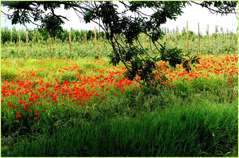 En ce printemps mitigé, l'artère bucolique du Gagne-Pain se refait quand même une beauté rouge vif. Semés par le vent et arrosés par la pluie, les coquelicots obéissant à des cycles qui m'échappent. Ils se répandent au hasard, rarement au même endroit que l'an précédent. Un champ se couvre soudain de flaques écarlates. Dame Nature saigne, souffre avec majesté ! J. P.