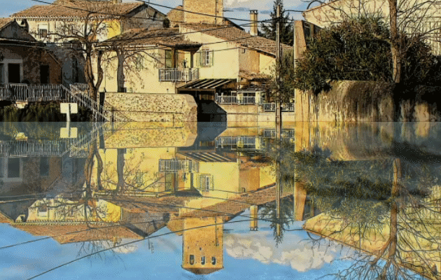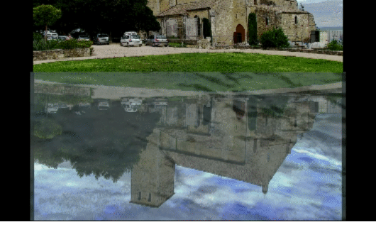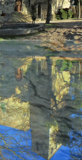 En débordant, cette-fois-ci, sur Bollène, peut-être soulèverai-je un chouia de curiosité ? La collégiale Saint-Martin, qui a connu bien des péripéties, se reflète ici dans son jardin devenu aquatique. On n'est effectivement pas forcé de trouver ça drôle.