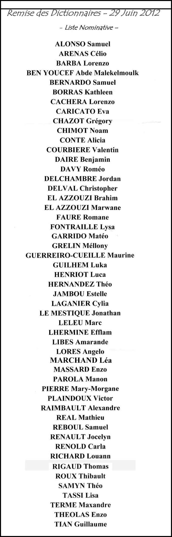 51 enfants sont admis en 6ème à la rentrée prochaine. La municipalité leur a offert un dictionnaire. Liste nominavite