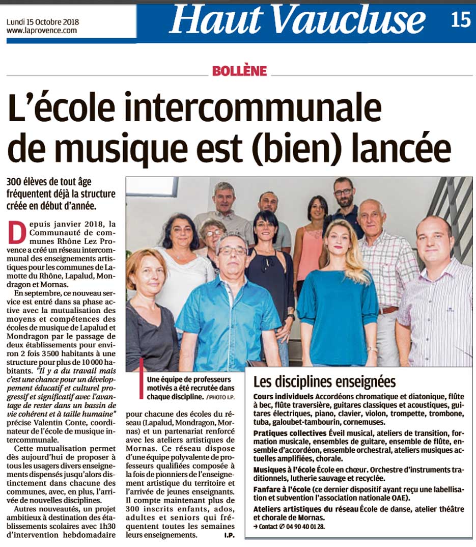 Dans le cadre de l’école intercommunale de musique, mise en place depuis janvier 2018 (voir article presse), les auditions publiques sont appelées à regrouper des élèves des communes de Lapalud, Lamotte-du-Rhône, Mondragon et Mornas. D’où cette assistance inhabituelle, mardi soir, qui a littéralement pris d’assaut l’espace culturel Jean Ferrat, à Mondragon. L’atelier de transition (débutants) et près d’une vingtaine d’exécutants de tous âges en solo ont successivement égrainé un répertoire éclectique, au gré de pratiques instrumentales tout aussi variées. Venues du territoire concerné, des familles entières ont pu apprécier ce nouveau dispositif éducatif qui brasse plus large et décloisonne les disciplines, au gré d’une équipe de professeurs renforcée. J. P.