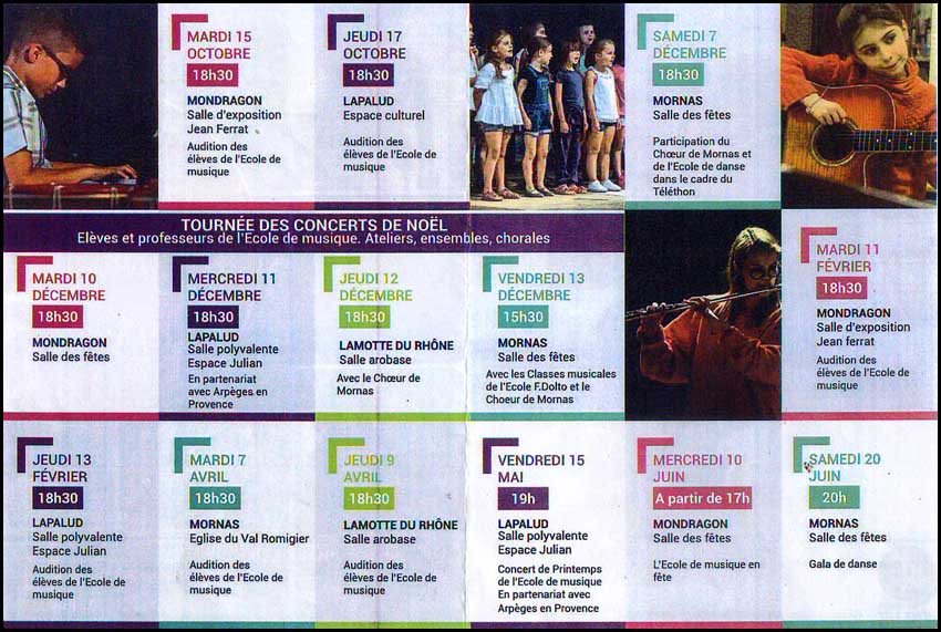 La première audition publique s’est déroulée à Mondragon, à l’espace culturel Jean-Ferrat, pour les classes de galoubet-tambourin, accordéon, clavier, piano et guitare. La suite comporte la tournée des concerts de Noël, courant décembre.