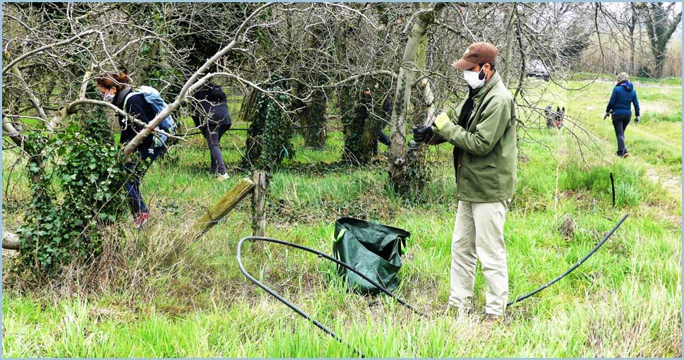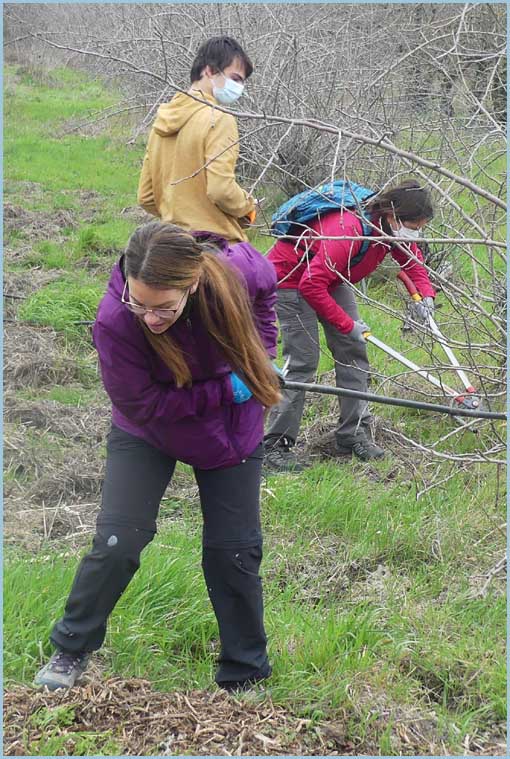 ![]() Ça défriche, cisaille, ratisse en tous sens... Vers midi, un éventuel pique-nique conclura le chantier bucolique.  |