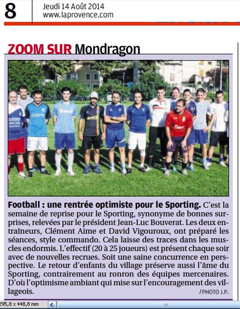 Teintée d’optimisme, l’assemblée générale du Sporting club s’est tenue au stade Gabriel Menu autour du président à poigne Jean-Luc Bouverat, élu voici tout juste un an. C’est pour lui « un moment privilégié de dialogue pour l’avenir du club. » Malgré quelques défections, l’effectif est resté constant avec 104 licenciés dont 45 seniors, 51 jeunes, 7 dirigeants et 1 arbitre. Ne sont pas concernés les plus jeunes, membres du Sporting club olympique Mondragon-Mornas (SCOMM) « dont je n’ai pas suivi l’évolution », regrette le président.