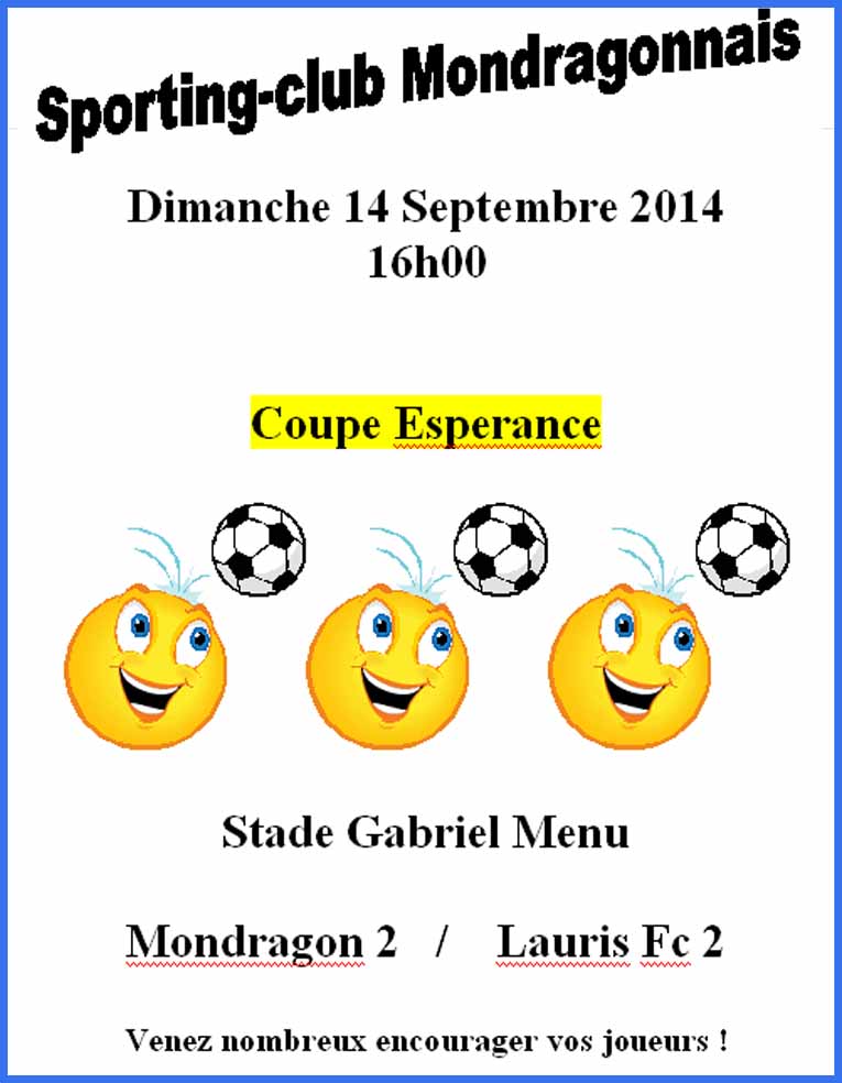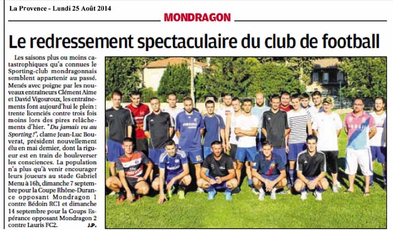 Match que Mondragon devait gagner mais qui s’est fort justement terminé sur le score de parité de 2 à 2  (2 buts de Julien Cavagna). Nous avons assisté à une bonne partie et de belles choses ont été réalisées par nos joueurs. L’apport technique et physique des nouvelles recrues ce fait déjà sentir, ce qui est de bons augures pour l’avenir. Les efforts aux entraînements aussi et cela se voit physiquement sur le terrain.