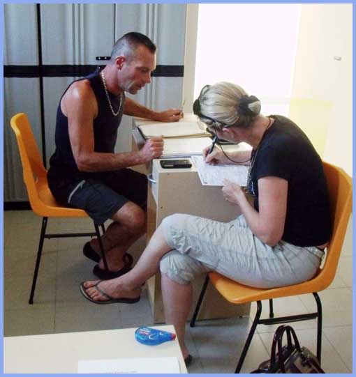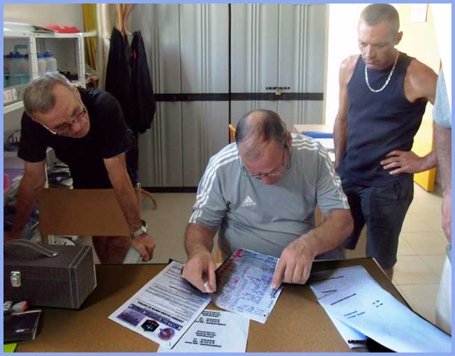 Guy, le trésorier en plein contrôle de chèques, avec Olivier (secrétaire) et Christian (arbitre)