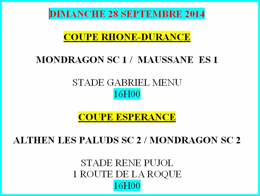 Troisième semaine d’entraînement et toujours autant de participants, à savoir une trentaine de personnes ! Du jamais vu au Sporting ! Pour preuve : Clément et David ont été obligés de faire deux matches amicaux ce jeudi 28 août. Une équipe partira jouer à Bourg-Saint-Andéol pendant que l’autre jouera à Mondragon contre Saint-Just d’Ardèche vers 19h00. Un autre match sera programmé début Septembre contre Bouchet, ceci pour préparer le match de coupe Rhône-Durance contre Bedoin le 7 Septembre 2014 au stade Gabriel Menu.