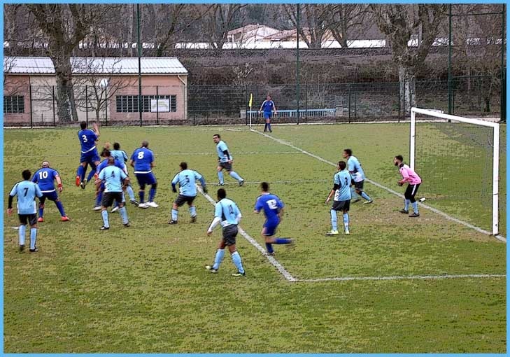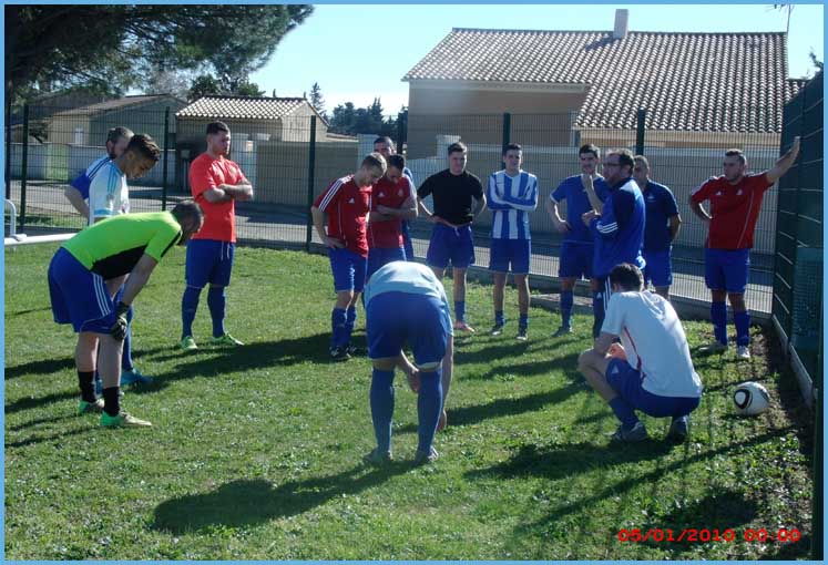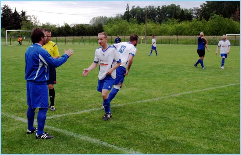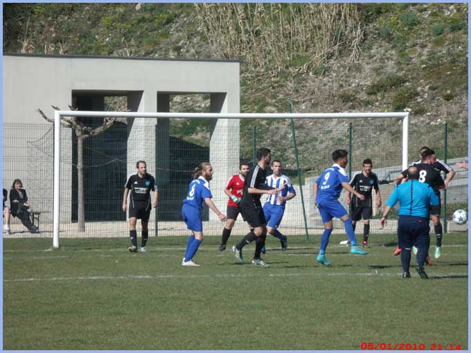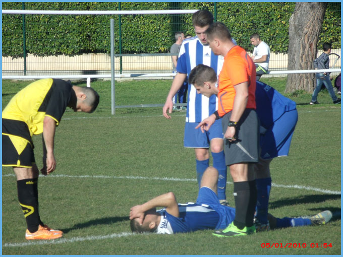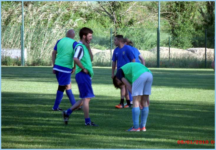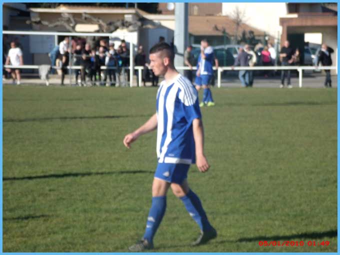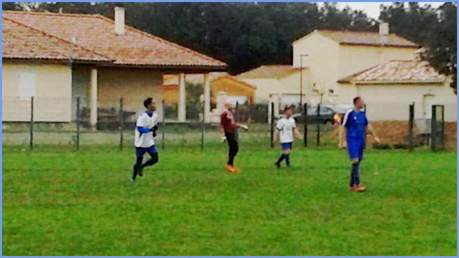 La première n’a pas fait de détails contre Sarrians puisqu’elle gagne par 6 à 2 mais encore avec un maximum de maladresse devant les buts ! Le score aurait pu être beaucoup plus lourd face à une équipe de Sarrians très courageuse et d’un très bon esprit ! 2 Buts de Cavagna Julien, 1 but de Paulin Renaud, 1 but de El Ouardi Kamal et 2 buts de Calvet Pablo. Rayon infirmerie, notons l’arrivée de Rudy (Boyer) qui a voulu se mesurer avec un poteau de ses buts. Le poteau a gagné ! Kamal  (qui a encore accumulé les sprints) s’est fait faire un maquillage par un joueur adverse, l’œil droit devrait normalement virer au bleu-vert–jaune !