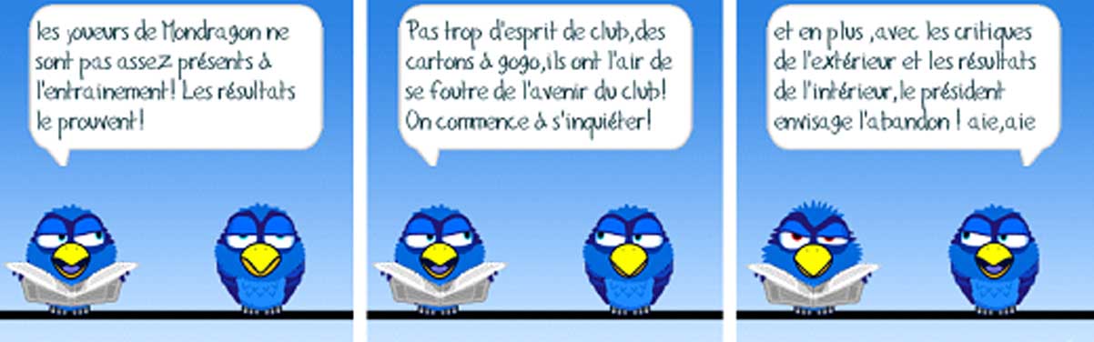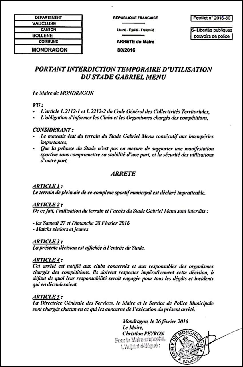 « N’ayant pas reçu la décision officielle de la commission, je me garderai de faire des commentaires sur les événements de Mondragon / Nyons, pour l’instant. Je retiens juste que nos joueurs n’ont pas été impliqués mais qu’il reste quelques efforts à faire au niveau de certains spectateurs pour la discipline et l’esprit du football. En effet, le principal grief est la conduite des supporters et en particulier un qui se déplace le dimanche avec une bombe anti-agression (doit-on fouiller les spectateurs à l’entrée à notre niveau ?) Ceci à fait très mal au club, ce qui est logique en soi ! Et surtout laisse une image déplorable aux yeux du district et des habitants. Mais, je le répète, les licenciés du club sont des gars bien élevés et ne méritent pas ça ! »