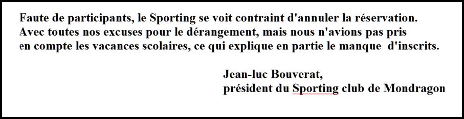 Reste un échec cuisant qui, selon le président, « pourrit la bonne marche du club. » Il projetait la fameuse fusion des deux clubs, Sporting-club Mondragon (SCM) et Sporting Olympique Mondragon-Mornas (SCOMM). Or, après concertation générale, Jean-Luc Bouverat s’est heurté à un refus haineux, mais il reste persuadé que seule une telle alliance assurerait la survie des deux clubs.          J. P.