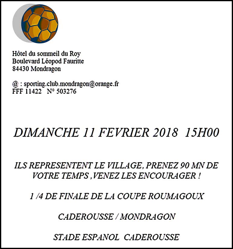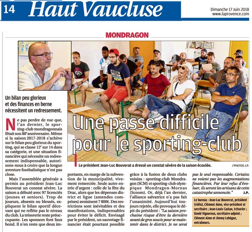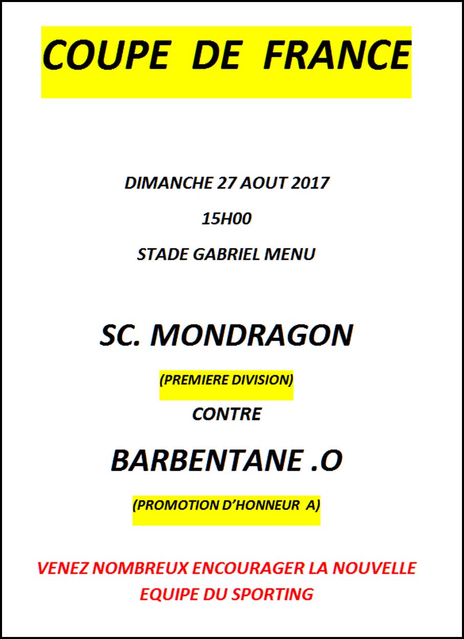 Reprise de la saison 2017-2018 pour le Sporting-club de Mondragon. Nous commençons fort en Coupe de France le 27 août contre Barbentane (deux divisions de plus). Mais tout est permis, même la victoire !