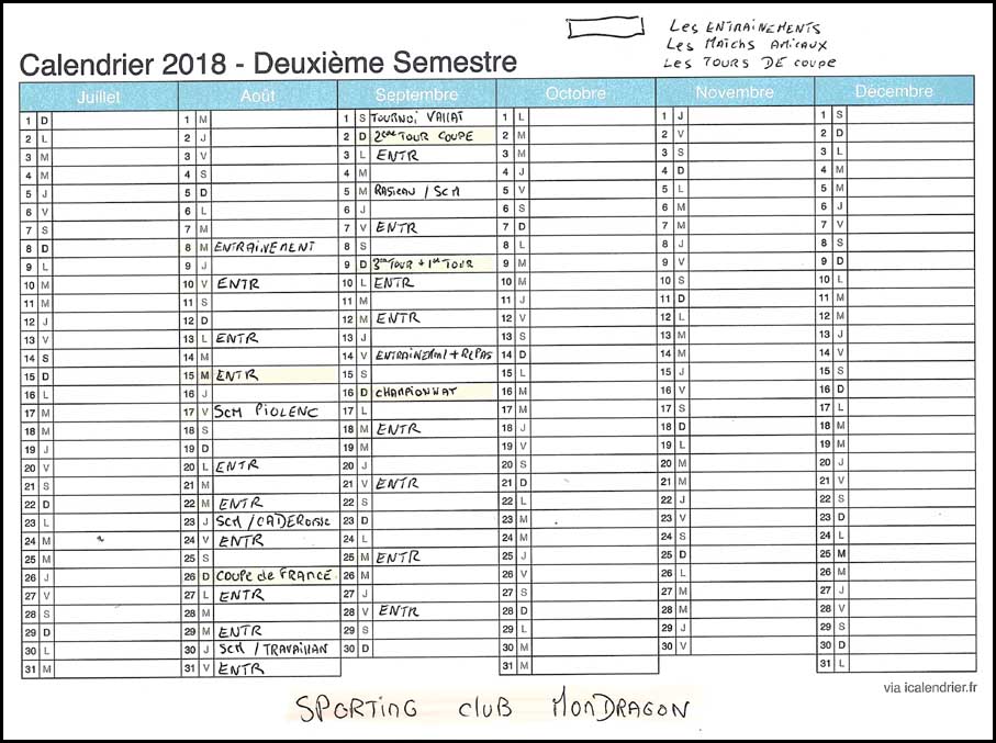 Pour le Sporting, encore deux matches amicaux mercredi 5 (Pierrelatte, Rasteau) et le championnat commence le dimanche 9 septembre par deux matches à l’extérieur (Vedene, Saint-Saturnin/Avignon).          Le président