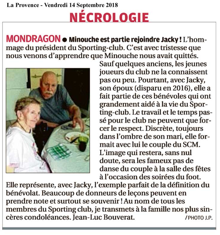 C’est avec tristesse que nous venons d’apprendre que « Minouche » nous avait quittés. Sauf quelques anciens, les jeunes joueurs du club ne la connaissent pas ou peu. Pourtant, avec Jacky, son époux (disparu en 2016), elle a fait partie de ces bénévoles qui ont grandement aidé à la vie du Sporting-club. Le travail et le temps passé pour le club ne peuvent que forcer le respect. Discrète, toujours dans l’ombre de son mari, elle formait avec lui « le couple du SCM ». L’image qui restera, sans nul doute, sera les fameux pas de danse du couple à la salle des fêtes à l’occasion des soirées du foot. Elle représente, avec Jacky, l’exemple parfait de la définition du bénévolat. Beaucoup de donneurs de leçons peuvent en prendre note et surtout se souvenir ! Au nom de tous les membres du Sporting club, je transmets à la famille nos plus sincères condoléances.
