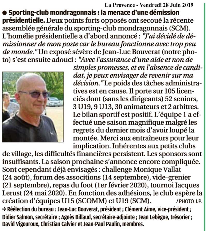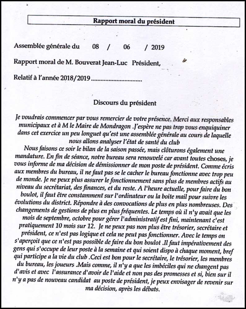 Deux points forts opposés ont secoué la récente assemblée générale du Sporting-club mondragonnais (SCM). L’homélie présidentielle a d’abord annoncé : « J’ai décidé de démissionner de mon poste car le bureau fonctionne avec trop peu de monde. » Un exposé sévère s’est ensuite adouci : « Avec l’assurance d’une aide et non de simples promesses, et en l’absence de candidat, je peux envisager de revenir sur ma décision. » Le poids des tâches administratives est en cause. Il porte sur 105 licenciés dont (sans les dirigeants) 52 seniors, 3 U19, 9 U13, 30 animateurs et 2 arbitres.