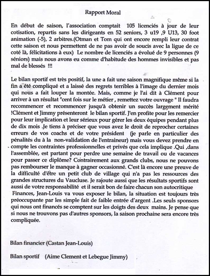 "Au-delà de la victoire, comme d'habitude contre Rasteau, le match (viril) s'est passé sans aucun problème. Rasteau, avec ses supporters, fait parti sûrement des équipes les plus sympathiques de la poule. Une interrogation cependant, pourquoi la présence constante de délégués sur deux matchs où, même par le passé, il n'y a jamais eu aucun problème ? Il y a sûrement une raison valable mais que l'on m'explique !"                         Le Président