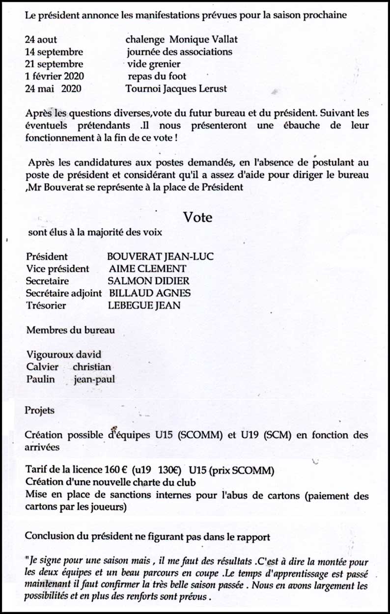 Le bilan sportif est positif. L’équipe 1 a effectué une saison magnifique malgré les regrets du dernier mois d’avoir loupé la montée. Merci aux entraîneurs pour leur implication. Inhérentes aux petits clubs de village, les difficultés financières persistent. Les sponsors sont insuffisants. La saison prochaine s’annonce encore compliquée. Sont cependant déjà envisagés : challenge Monique Vallat (24 août), forum des associtions (14 septembre), vide-grenier (21 septembre), repas du foot (1er février 2020), tournoi Jacques Lerust (24 mai 2020). En fonction des adhésions, le club espère la création d’équipes U15 (SCOMM) et U19 (SCM).
