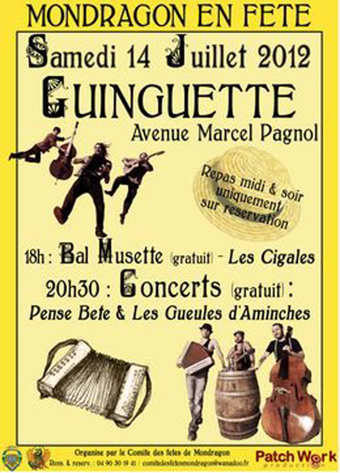 Rendez-vous ce samedi 14 juillet, non plus sur la place de la Paix (comme l’an dernier), mais avenue Marcel-Pagnol. Les concerts sont gratuits. Les repas sont à réserver au 04.90.30.19.41. A consulter : www.comitedesfetesmondragon.com/     Affiche