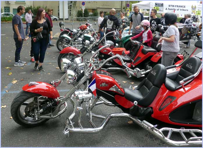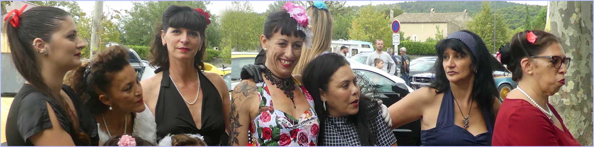 Comme surgies des sixties d’Hollywood, de belles filles côtoient une faune débonnaire, vêtue de jeans et de blousons noirs. Des groupes s’affairent autour de deux-roues mythiques. Apparemment flambant neufs, certains de ces engins s’inspirent de modèles des années 50 et 60. D’autres sont d’incroyables side-cars hors-série.