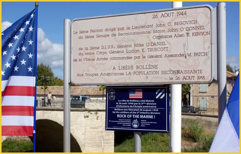 Ce dimanche en fin de matinée, le 68ème anniversaire de la libération de Bollène a justifié une cérémonie. Formé devant l’hôtel de ville, un cortège a rassemblé les élus locaux, le vice-président du Conseil général, les représentants d’associations patriotiques et de la gendarmerie, et de nombreux citadins. Tous se sont rendus devant la plaque commémorative, située au bord du Lez sur le cours de la République et rappelant en substance ces faits : « La ville de Bollène a été libérée le 26 août 1944 par la 3ème division d’infanterie de l’Armée américaine, »