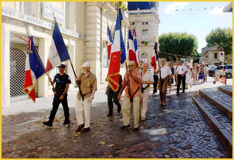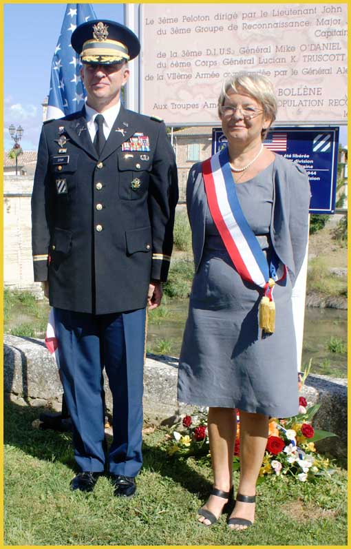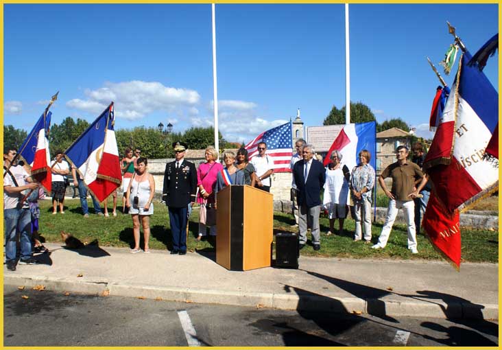 Déjà présent l’an dernier, le colonel Stoy, membre de cette division américaine qu’il représente aujourd’hui, est venu en personne honorer la commémoration. Marie-Claude Bompard, maire, a proposé d’entendre, en plus de l’hymne national, trois sonneries : le chant des partisans en hommage aux forces françaises libres et de l’intérieur, dont notamment Honoré d’Estienne d’Orves, fusillé en 1941, puis celle de la première armée française du général de Lattre de Tassigny, débarquée en août 1944 sur les plages de Provence, enfin l’hymne américain, car ce sont les chars américains qui sont entrés dans la ville, tandis que les Allemands fuyaient vers le Nord.