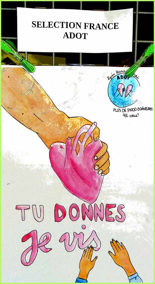 Dans un tel contexte, l’intervention de France Adot tombe sous le sens. D’où ces affiches de sensibilisation et d’informations européennes sur le don d’organes, réalisées par les lycéens. Trois d’entre elles ont été retenues par France Adot qui les publiera sur son site Internet.