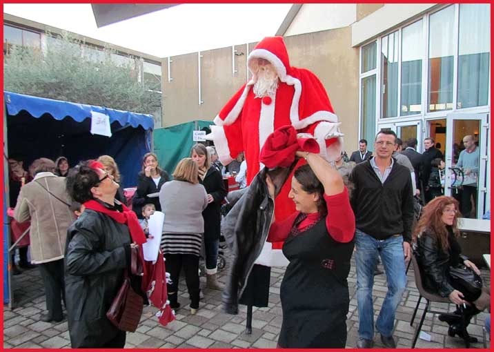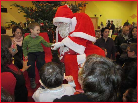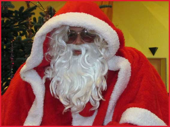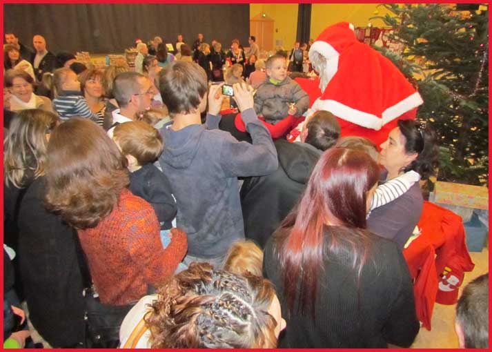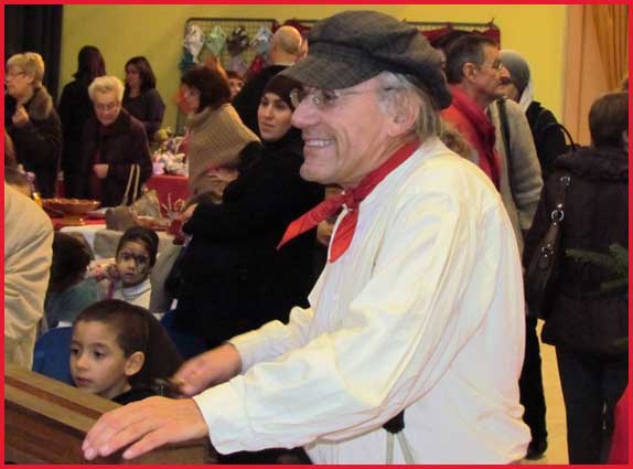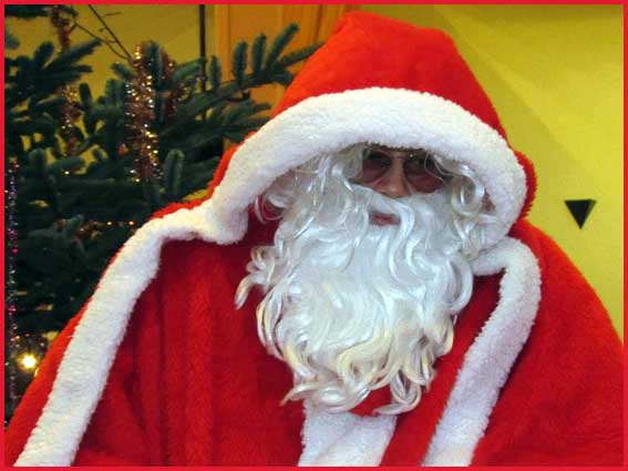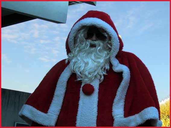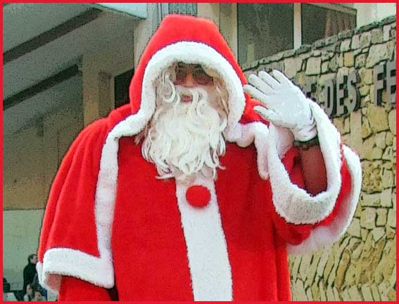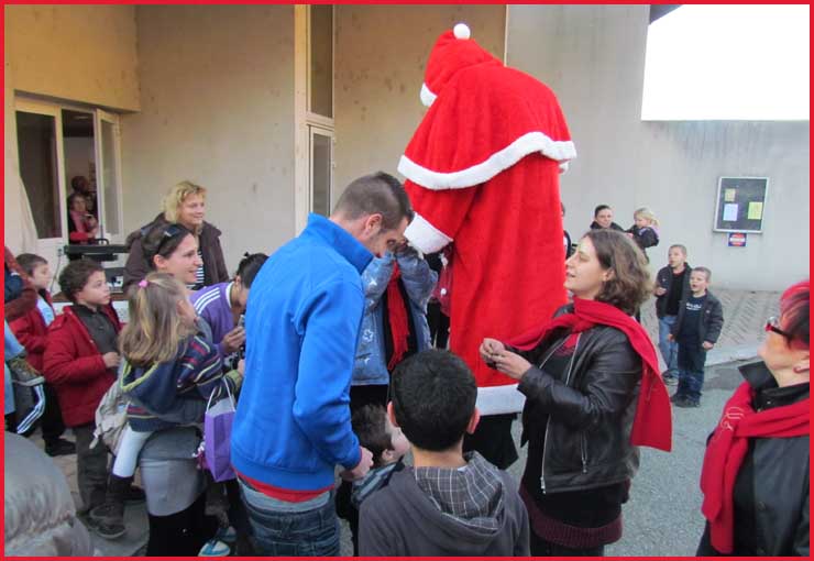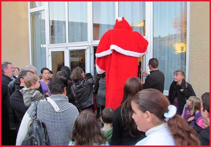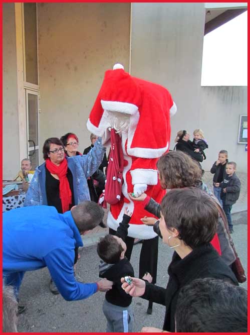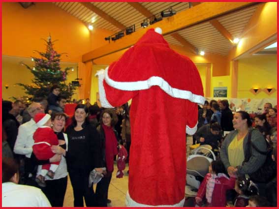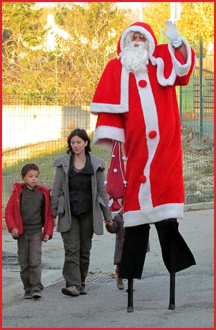 ![]() ![]() ![]() ![]() Ah ! Ça, c'est nouveau... Juché sur des échasses, le Père Noël fait sensation ! Il est escorté par Jocelyne et Aurélie... qui ont le torticolis à force de regarder en l'air pour voir s'il marche droit ! |