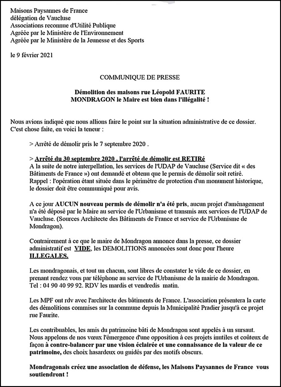 C'est un sujet délicat, mais qui ne peut être occulté. J'attends toujours une réaction éventuelle du maire Christian Peyron, auquel j'ai envoyé une copie de ce courrier, mais qui affirme être dans la légalité avec un permis de démolition. A suivre...? J. P.