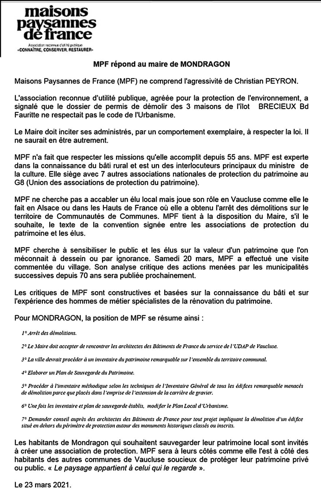 Ville de Mondragon - Patrimoine - Mardi 23 Mars 2021 Réponse au maire de Mondragon Episode précédent