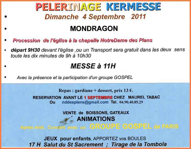 • Après-midi : kermesse et animations, concert par un groupe Gospel de Paris. Jeux enfants, concours de pétanque, tombola.