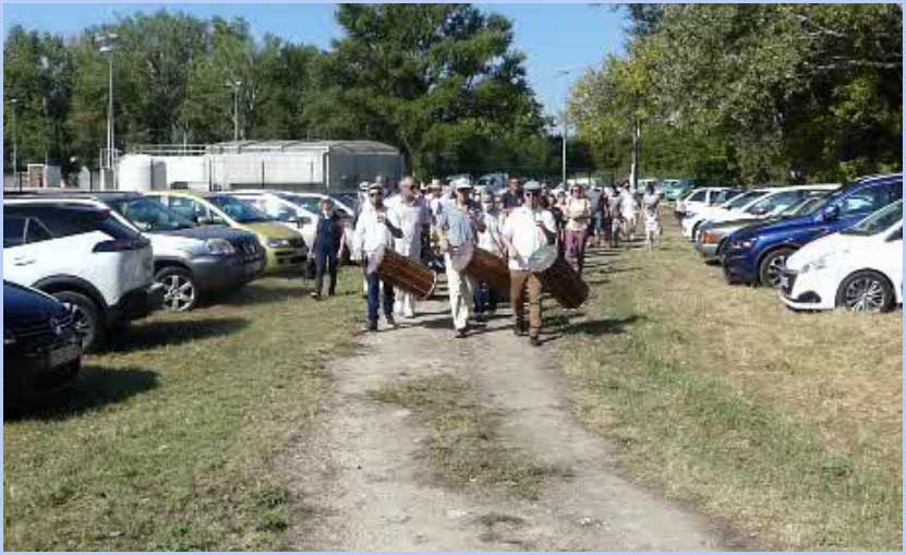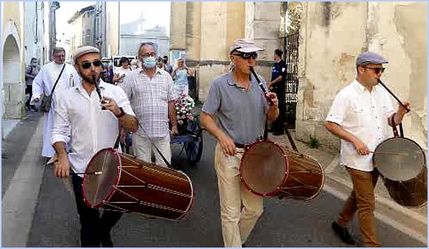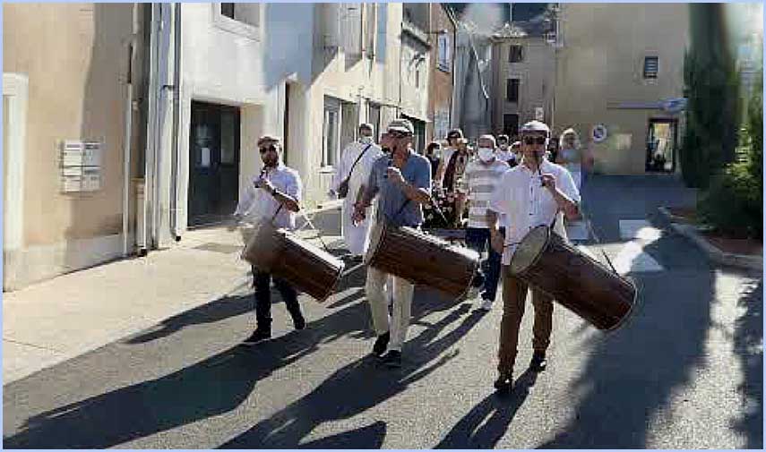 ![]() Le dispositif mobile marche au pas des tambourinaires. |