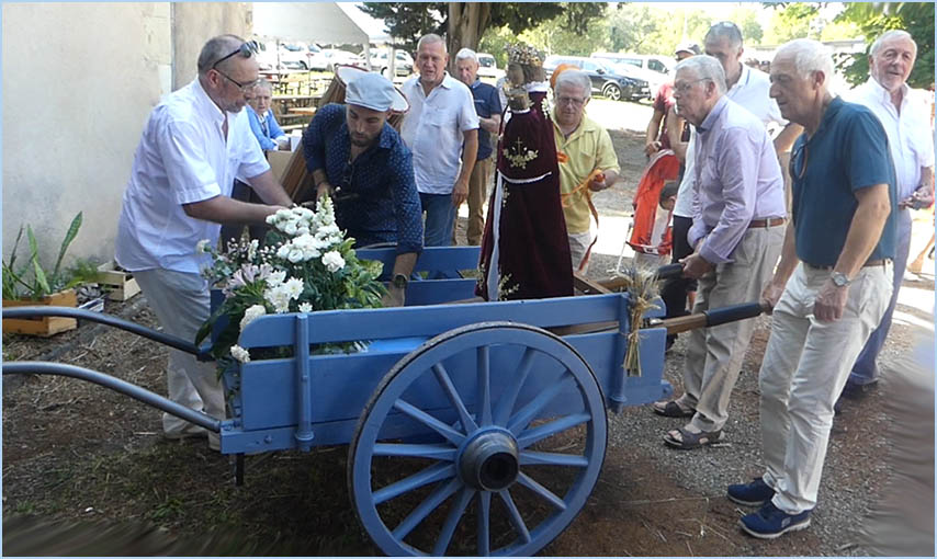 derrière la statue de la Vierge, véhiculée sur une charrette