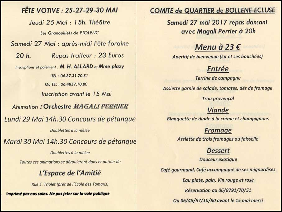 Pour conclure ce joli mois de mai, voici la fête des quartiers Nord, proposée par le comité de Bollène-Ecluse du 25 au 30 mai (théâtre, repas dansant, fête foraine, pétanque, etc.)