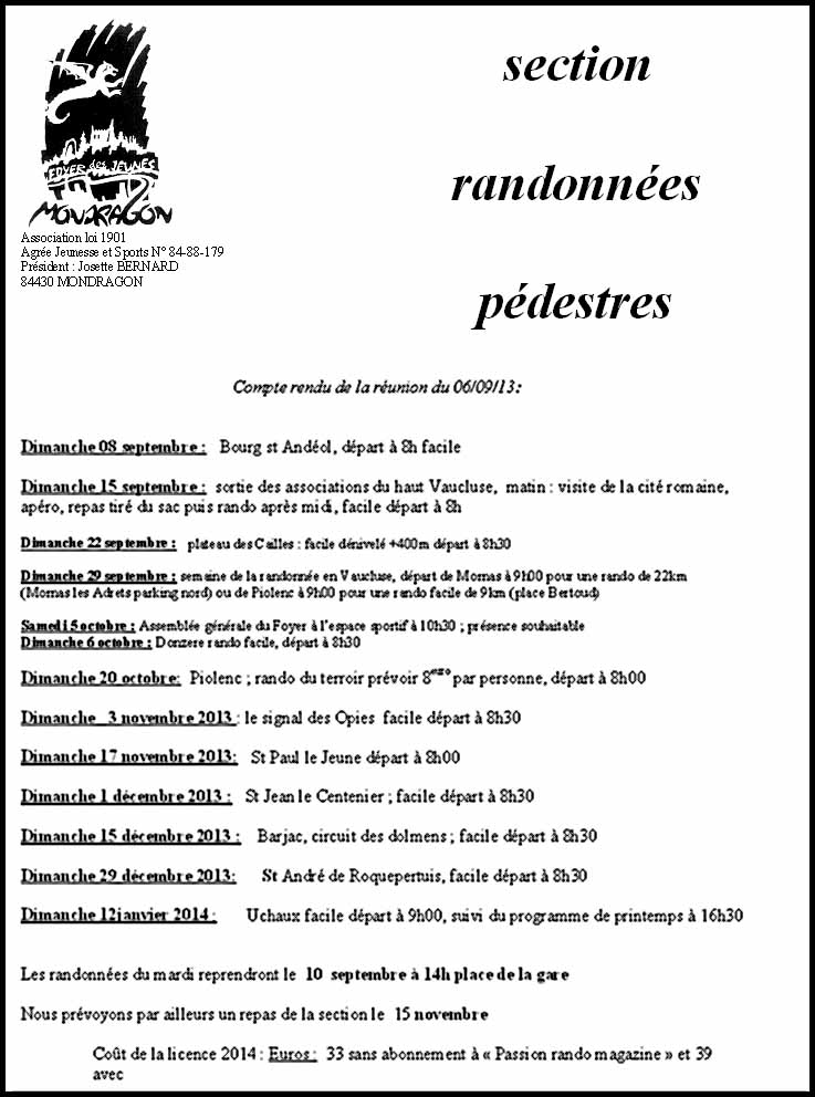 L’assemblée générale du Foyer des jeunes est prévue le samedi 5 octobre à 10h30 à l’espace sportif (présence souhaitée). Le repas des randonneurs est prévu pour vendredi 15 novembre. Coût de la licence 2014 : 33 €, avec la revue Passion Rando : 39 €. Contact : Michel Tarsac, 04 90 40 91 36.