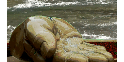 voir inauguration), une grande main nous est tendue à l'entrée Nord du village. Les mieux attentionnés (dont je suis), y ont vu un signe de bienvenue. Les râleurs ont plutôt imaginé une quête, destinée à subvenir au coût de l'embellissement du centre ville. Ce fragment humain, d'une belle morphologie, n'en demeure pas moins une jolie sculpture, couplée à une fontaine.