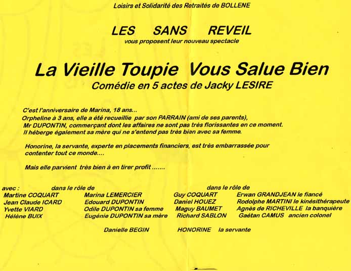 C’est là qu’interviennent « Les Sans Réveil » qui, outre le calendrier de rencontres ponctuelles (voir plus bas), élargissent l’impact médiatique par le biais du théâtre. Ce n’est pas une mince affaire pour une troupe amateur qui concocte un spectacle durant des répétitions assidues. Son choix porte, cette année, sur « La vieille toupie vous salue bien », une comédie en cinq actes de Jacky Lesire.