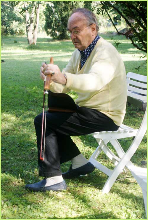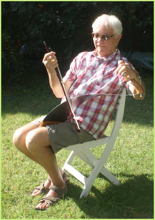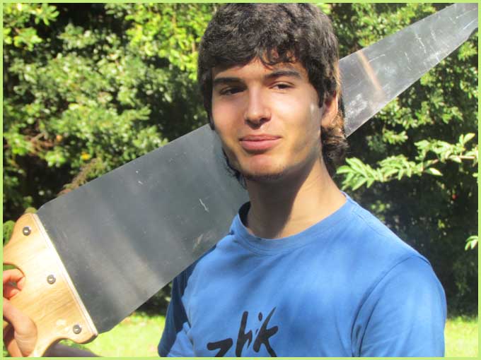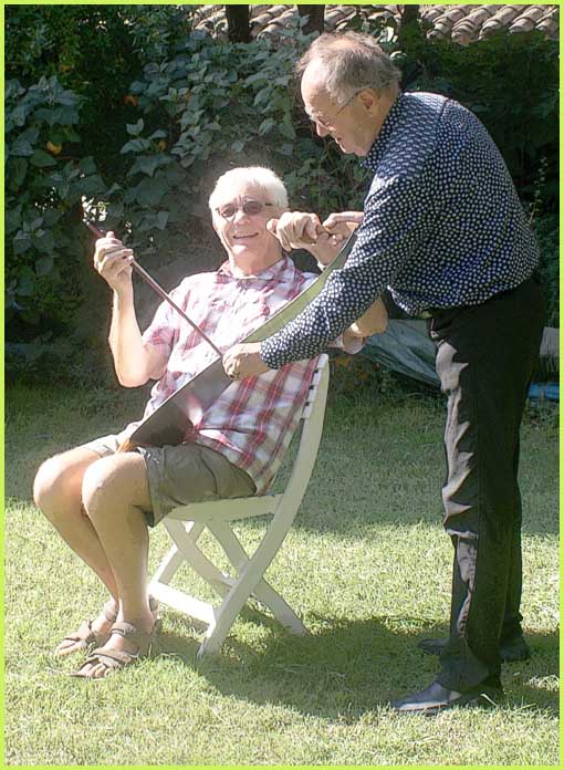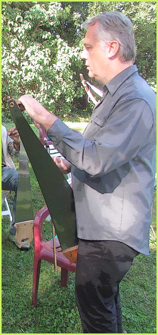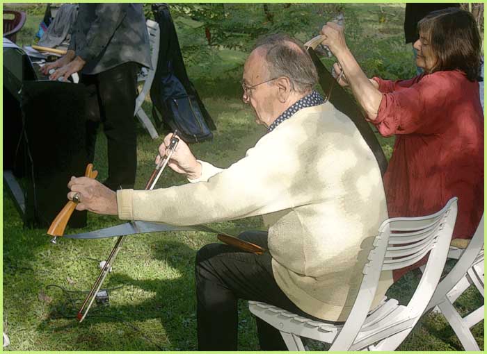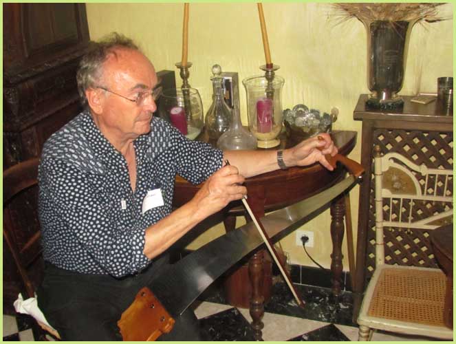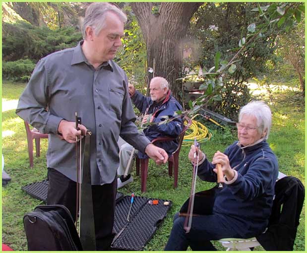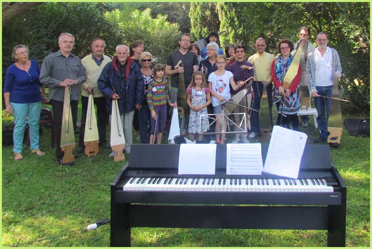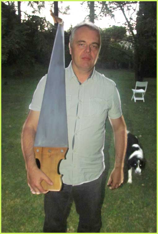 A la fois musical et bucolique, ce stage avait pour cadre le parc magnifique d’une demeure bourgeoise, celle de Christian de Bimard, initié à la scie musicale comme l’était avant lui son propre père (voir précéent volet). Revigoré, l’an dernier, par un stage auprès de Jean-Claude Welche, spécialiste du genre, son goût pour cet instrument particulier a débouché chez lui par un week-end de découverte et de perfectionnement pour une douzaine de stagiaires, venus d’un peu partout en France. Ils étaient pourvus d’une égoïne édentée, car désormais destinée aux caresses d’un archet et non plus aux coupes brutales des rondins.