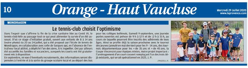 Dans l’espoir que s’affirme la fin de la crise sanitaire liée au Covid 19, le Tennis-club hèle au passage tout ce qui peut alimenter la survie d’un été assoupi. D’où ce stage d’initiation gratuit, ouvert aux enfants de 8 à 14 ans du 20 au 24 juillet, proposé par l’école de tennis de Mondragon, en collaboration avec celle de Sorgues qui, en l’absence de l’entraîneur local attitré, dépêche l’un des siens, Eric Ingwiller. Sont par ailleurs accueillis les familles et vacanciers, auxquels les courts sont gratuitement mis à disposition.