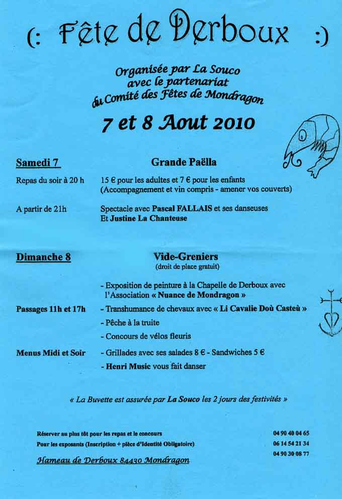 Rendez-vous donc à Derboux  les samedi 7 et dimanche 8 août : paella et spectacle (samedi soir), vide-grenier et activités multiples (dimanche toute la journée). Contact : 04.90.40.04.65.   Programme