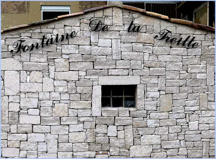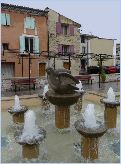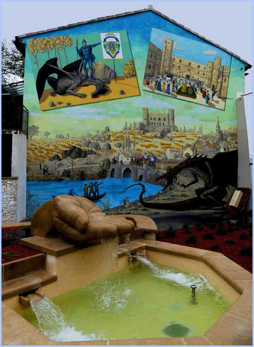 La suppression de l’immeuble Charrier accroît la visibilité du carrefour. Une fresque, due à Valérie Micheaux, habille un grand mur et représente la Légende du Drac, symbole du village.  L'illustration est davantage du style Renaissance que médiéval. C''est  quand même très joli. Une aire de stationnement est agrémentée d’une autre fontaine, dotée d’un bassin et d’une sculpture : une grande main tendue... Le visiteur peut y voir un signe de bienvenue et une quête d'amitié.