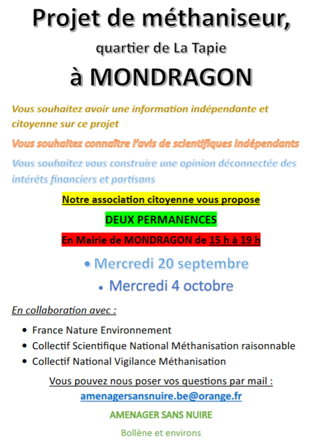 envisagées deux permanences à la mairie de Mondragon, ouvertes au
