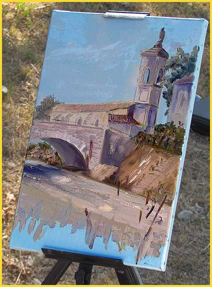 Au bord du Lez, dix peintres et leurs chevalets se côtoient à l’ombre, entre les deux ponts. Ils tournent tous le dos au pont de l’Europe, d’une architecture sans âme, et lui préfèrent le vieux pont en pierre de Chabrières, qui accapare tous les regards. La proximité de la chapelle de Notre-Dame du Pont, qui se reflète dans l’eau, ajoute à l’esthétique.