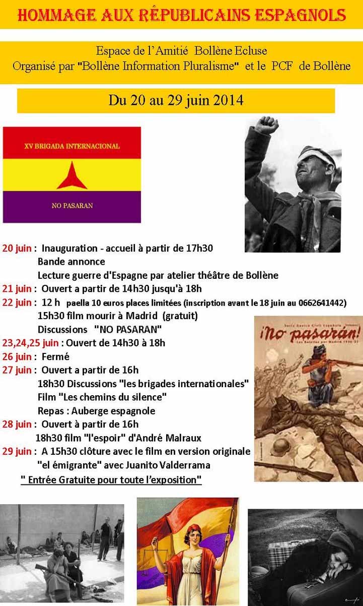 Vendredi soir, à l’Espace de l’Amitié, était donné le coup d’envoi d’un hommage aux Républicains espagnols, étalé sur dix jours, au gré d’un programme « musclé », concocté par Bollène Information-Pluralisme (BIP) et la section locale du PCF. Sur le fond rouge vif de six panneaux, des photos et  des textes retracent la guerre civile d’Espagne, l’engagement des femmes de conviction, les oubliés de la guerre, etc. Des textes engagés seront lus par trois comédiennes de l’Atelier Théâtre. L’exposition d’objets divers, dus à l’artisanat d’art, détend l’atmosphère.