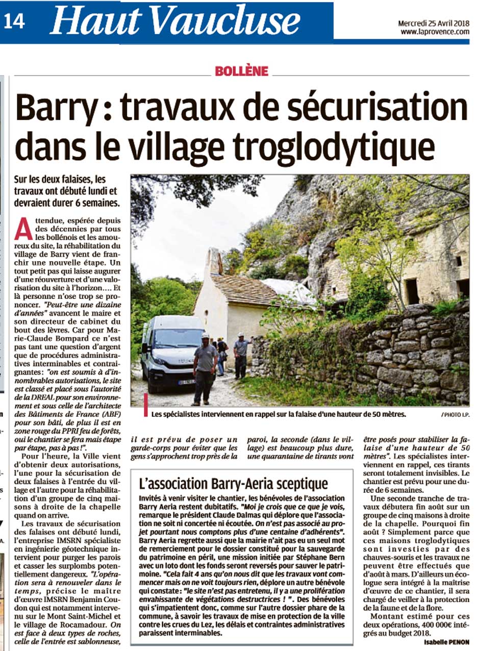 Face à l’interdiction d’accès du site troglodytique de Barry, depuis 2009, pour cause de risque d’éboulement, l’association de sauvegarde Barry Aeria reste sur le qui-vive et donc en quête d’une réelle reprise d’activité, autres que ses actions parallèles telles que balades instructives en zone autorisée, conférences ou expositions. Or il y aurait du nouveau. Lors d’une récente visite du site, la Ville annonçait le début des travaux de sécurisation de deux falaises, et donc la réouverture prochaine du site. Mais Barry Aeria reste sceptique, tant sont lourdes les procédures administratives.