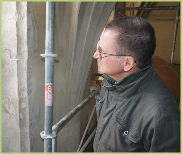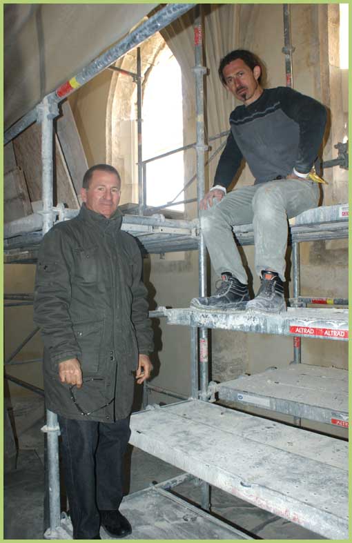 Claude Raoux, adjoint au patrimoine, et Fabien, chef de chantier, m'ont baladé dans les travaux labyrinthiques. Le remplage (à droite) a l'air de prendre son envol...