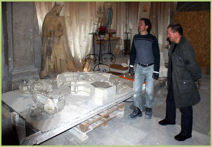 Aujourd’hui, trois ou quatre chapelles sont en chantier. Ici, manque  provisoirement un autel. Là, un retable. Deux maçons, Thomas et Hamadi, redressent une voûte à coups de truelle. Des statues dérangées président dignement le pieux désordre qui, selon M. le curé, « désclérose les vieilles habitudes. »