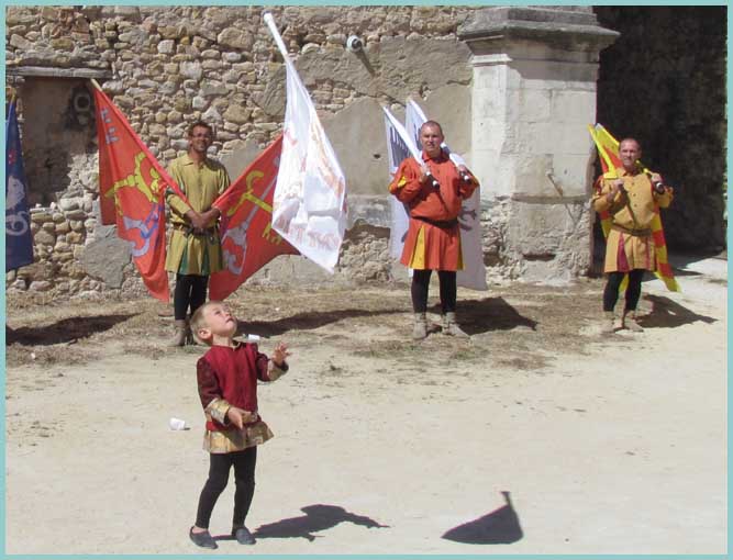 Jules, le benjamin, suit l'exemple de ses aînés.                              Les tambours accompagnent les lanceurs de drapeaux.