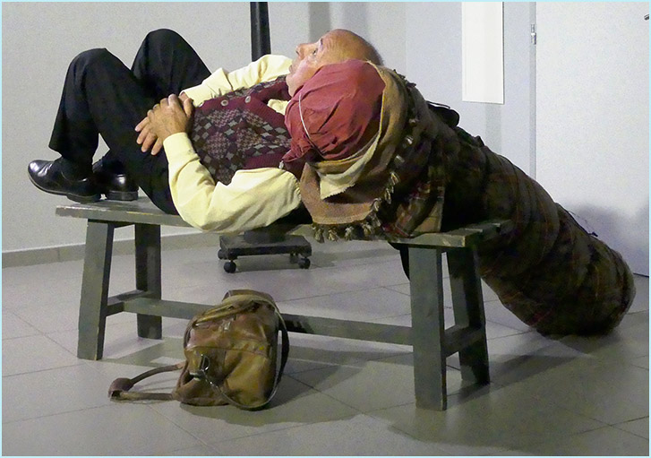 s'avachit sur un banc. Que trimbale-t-il, enroulé dans