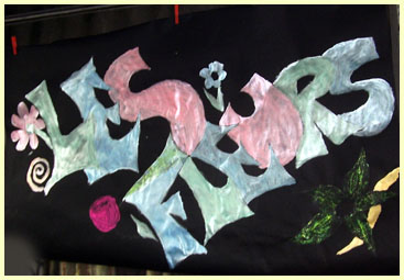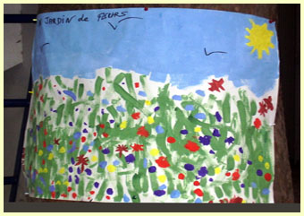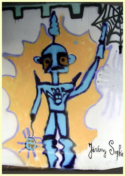 La fresque est terminée à temps pour décorer la fête. Elle déborde du projet initial. C'est tendance post-médiévale mâtinée futuriste. Il s'agit d' une oeuvre collective. Tout le monde a signé. Ce décor est indélébile et survivra longtemps |