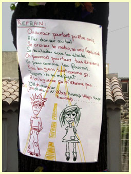 Comme toujours Les paroles d'une chanson sont affichées sur les troncs d'arbre... Voyons cela ! |