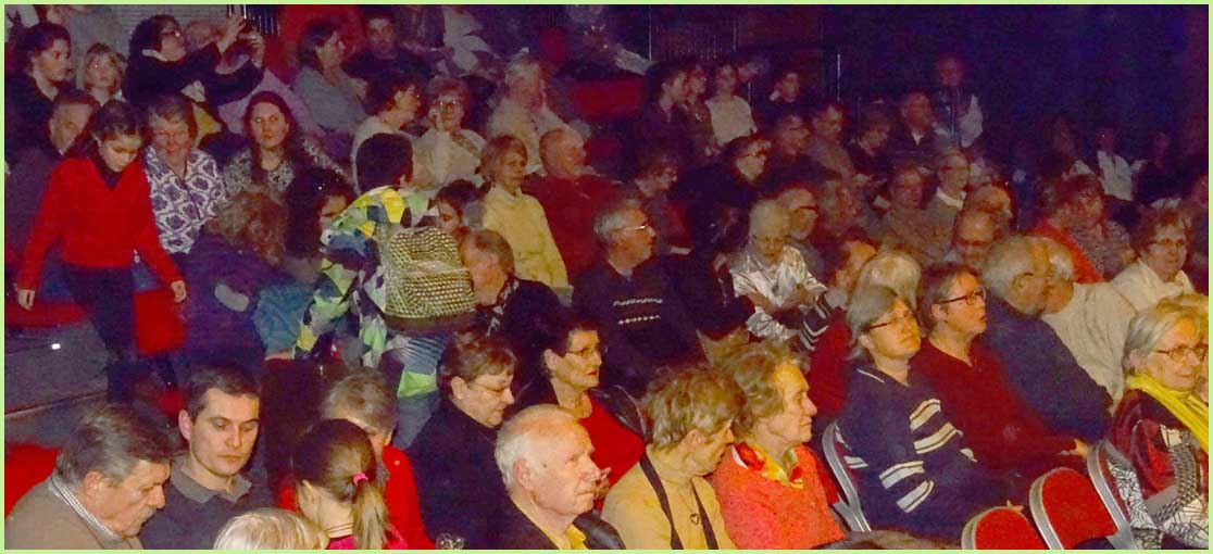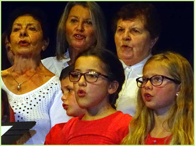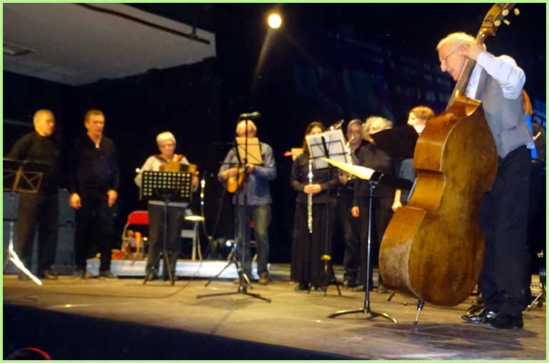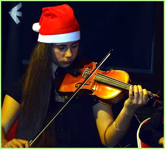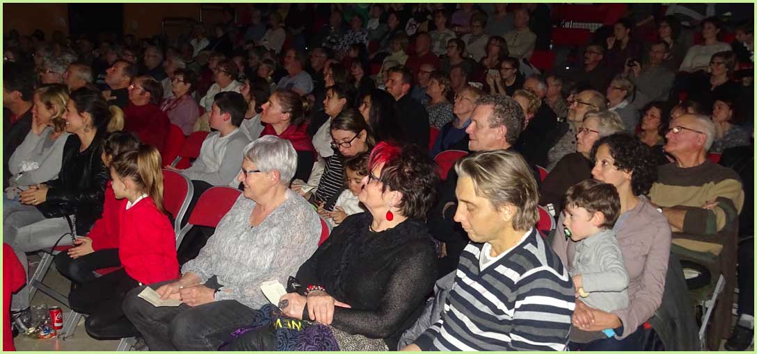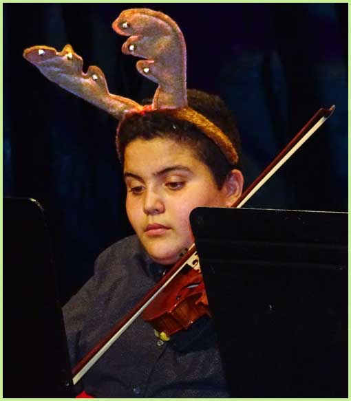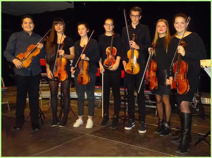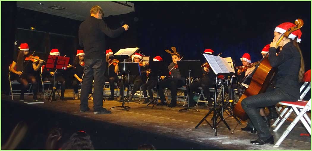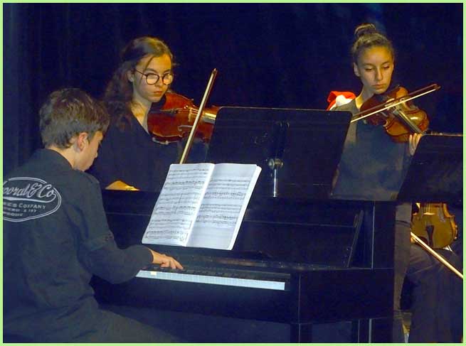 Après l’entracte et la buvette de l’APE, un trio (deux violons et un piano) ont fort bien joué Beethoven (contredanses). L’orchestre à cordes (initiation) a ravi l’auditoire avec un canon (Pachelbel) et Douce nuit. Mention spéciale pour l’ensemble à cordes qui a superbement servi Vivaldi. Au final, l’atelier voix (adultes) et la chorale enfants, très applaudis, ont conclu en chantant Noël.                J. P.