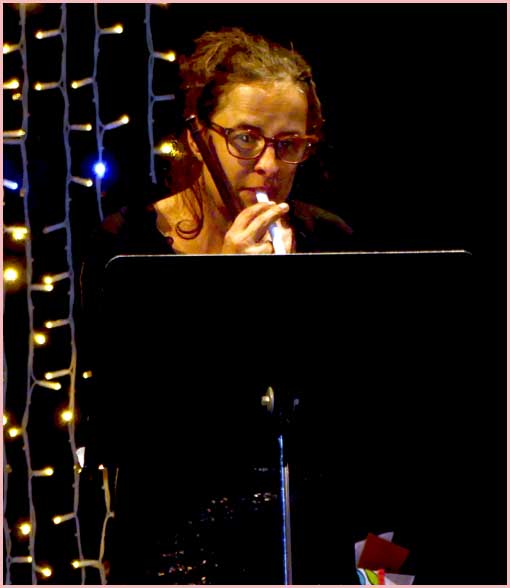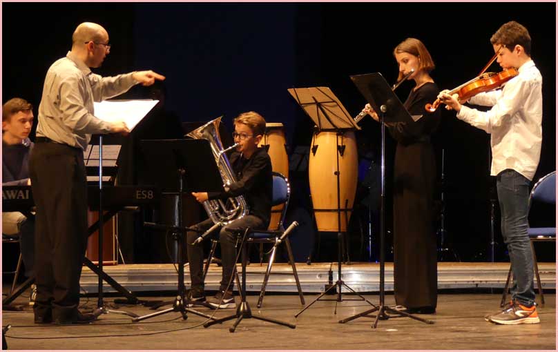 Face aux gradins, qui ont fait le plein, une vue plongeante sur la scène portait sur une file ininterrompue d’exécutants. Rappelons que le conservatoire en compte 300 de tous âges, encadrés par une quinzaine de professeurs. Une bonne moitié de l’effectif était sur scène ce soir-là. En toile de fond, sur un grand écran, un diaporama égrenait une série d’images sur le thème de l’hiver et de Noël. Quel superbe dispositif, encore enjolivé par l’arrivée du Père Noël !